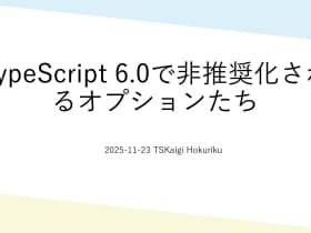 TypeScript 6.0で非推奨化されるオプションたち CRANK 2025-11-23 TSKaigi Hokuriku 2025 speakerdeck.com 8 days ago Related Topics: TypeScript arrow_back open_in_new Open page https://speakerdeck.com/uhyo/typescript-6-dot-0defei-tui-jiang-hua-sareruopusiyontati 1 comments uhyo @uhyo 7 days ago 先ほどのトークのスライドです。誤った情報が載っていたところは修正済み(?)speakerdeck.com/uhyo/typescrip…#TSKaigi #TSKaigiHokuriku