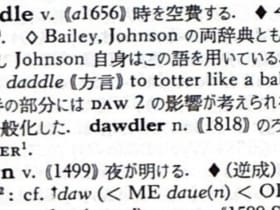 研究社『英語語源辞典』(KDEE)を通読しながら見つけた語源の面白いネタをメモしています。今回はp322からp323まで。今年もよろしくお願いします。 英語語源辞典 〈新装版〉 - 研究社 英単語の歴史を学術的にたどる、本格派語源辞典 寺澤芳雄 編 books.kenkyusha.co.jp dawdle “dawdle”は「時を空費する、ぐずぐずする」という意味の口語的な動詞である。この語の語源は不詳であり、Bailey, Johnsonの両辞書にも記載がない。しかしJohnson自身はこの語を使っているらしくおもしろい。初出1656年前後で、18世紀
