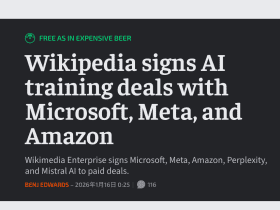 1月16日、Ars Technicaが「Wikipedia will share content with AI firms in new licensing deals」と題した記事を公開した。この記事では、ウィキメディア財団が大手AI企業各社と締結した、Wikipediaコンテンツの利用に関する新たなライセンス契約について詳しく紹介されている。