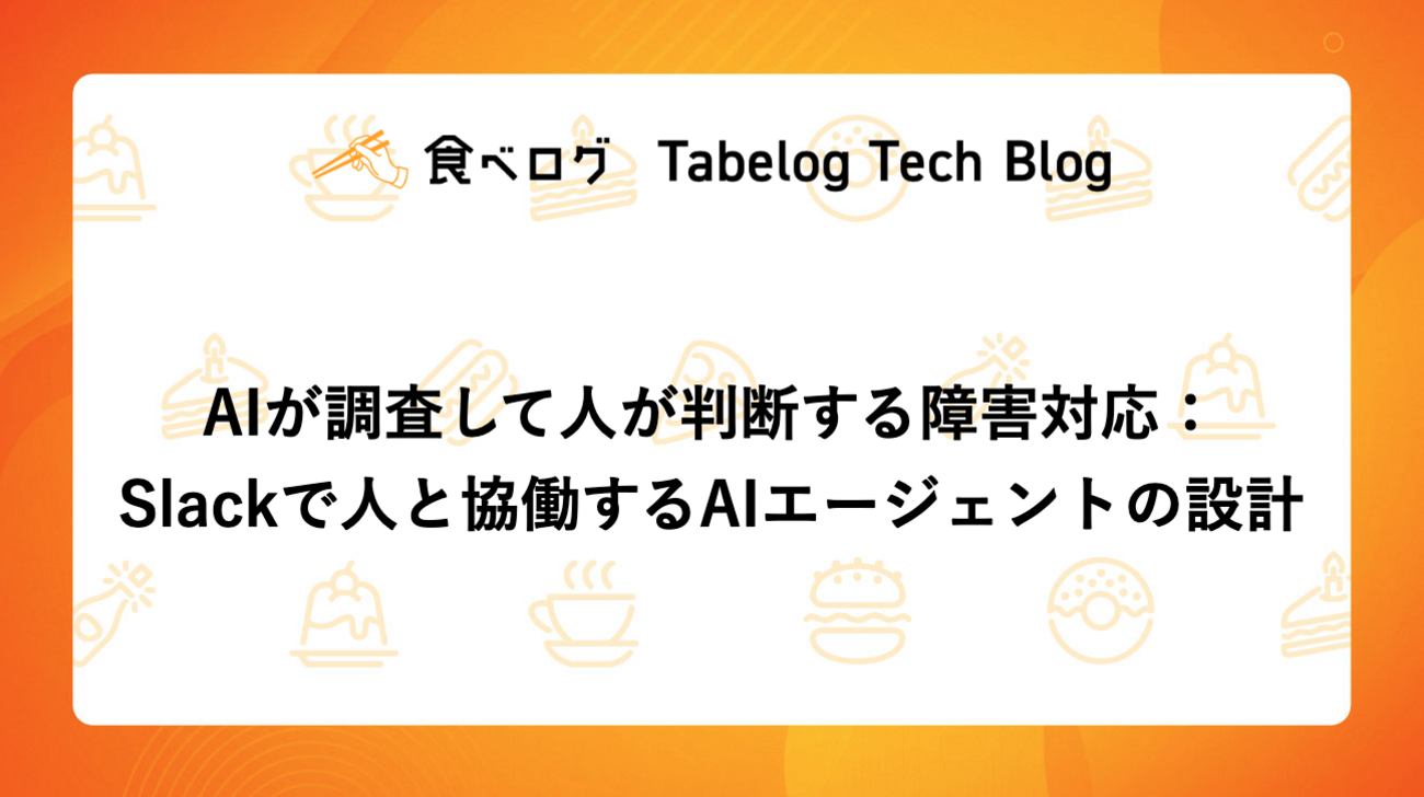 はじめに こんにちは。AIトランスフォーメーション推進部に所属している遠藤怜です。 本記事では、食べログの検索システムの障害対応における初動をSlack上のAIエージェントで効率化した事例について紹介します。 この取り組みはSalesforce主催のイベント「Agentforce World Tour Tokyo 2025」でも事例として紹介されました。 記事内では、AIエージェントをどのように設計・実装し、運用に乗せたかを解説します。 今回作成したAIエージェントは、Slackのスレッドから会話の文脈を読み取り、必要に応じてデータ分析や社内ナレッジ検索、Web検索といったツールを呼び出します…
