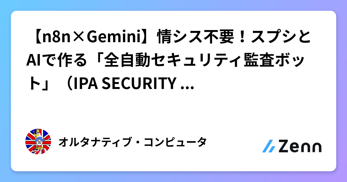はじめに:セキュリティ宣言は「作った後」が一番大変昨今、大手企業との取引やIT導入補助金の要件として 「IPA SECURITY ACTION(セキュリティ対策自己宣言)」 の取得が求められるケースが増えています。特に「★★(二つ星)」を取得するには、自社の「情報セキュリティ基本方針」を定めて公開する必要があります。しかし、専任の情シス担当者がいない数名規模のチームにとって、本当の地獄は方針を定めた「後」にやってきます。方針に「パスワードを定期的に変更する」「定期的にアカウントの棚卸しをする」と書いたものの、日々の業務に追われて誰も監査を回さず、完全に形骸化してしまうのです。そこで今回は、n8nとGemini(生成AI)、そしてGoogleスプレッドシートを組み合わせて、 「現場の負担ゼロで毎月自動でセキュリティ監査とアラート通知を行い、証跡(ログ)まで残すボット」 の作り方を解説します。💡 ワークフローの全体像(処理の流れ)複雑なActive Directory(AD)やIDaaSの連携は使いません。小規模チームの実態に合わせ、「Googleスプレッドシートのアカウント台帳」をマスターとして処理します。Schedule Trigger: 毎月1日など、指定した日時に自…