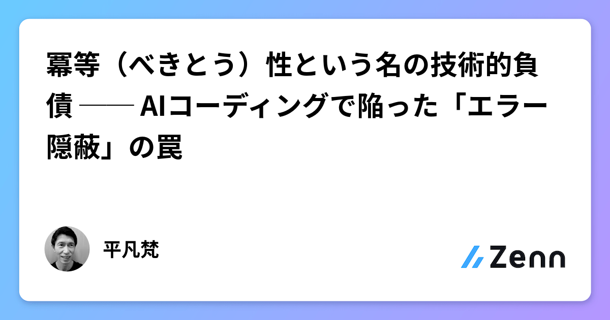 はじめにAIコーディングアシスタントと開発していて、ある落とし穴に気づいた。エラーが発生したとき、AIはエラーを「抑え込んで」処理を継続させる方向で対応する。 その対応に「冪等性の確保」という名前がつくと、正しい設計判断に見えてしまう。しかし実際には、真の問題を隠蔽していただけだった。この記事では、Flutter アプリ開発で実際に体験した「冪等性の罠」を通じて、エラー対応の本質について考える。冪等性とは冪等性(idempotency)とは、ある操作を何度実行しても1回実行したときと同じ結果になる性質。APIでいえば、同じリクエストを2回送っても1回送ったときと同じ結果になること。データベースでいえば、同じINSERTを2回実行しても重複レコードが作られないこと。冪等性は分散システムやネットワーク通信において非常に重要な概念であり、リトライ処理やイベント駆動アーキテクチャの信頼性を支える基盤である。冪等性が「正しい」場面軍事システム、医療機器、航空管制 ── これらの分野では、あらゆる状況下で処理を継続させることが最優先される。ミサイル防衛システムで同じ脅威の通知が2回届いても、2発迎撃しない心臓ペースメーカーが同じ信号を…