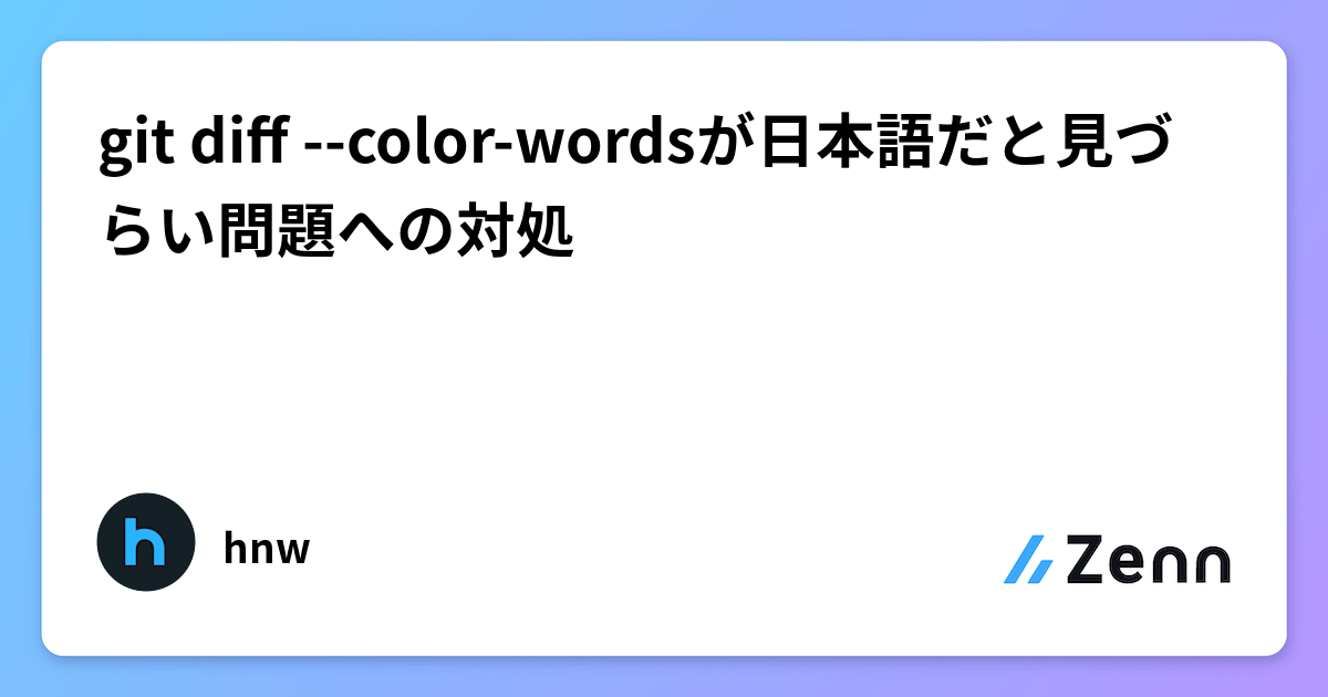Git で単語単位で差分を見たい場合、 git diff --color-wordsが便利です。特に 1 行が長くて差分が多い場合は変更箇所がわかりやすくなります。しかし、このコマンドは単語区切りを英語基準で考えるため、日本語の文章に対する差分が大きく判定されてしまい、パッと見で理解できないことがあります。この問題に対し、日本語の文字集合も考慮した単語区切りオプション「--word-diff-regex="[a-zA-Z0-9_]+ [ぁ-ん]+ [ァ-ヶー]+ [一-龥々〇〆]+ ."」を使うといい感じになります。この --word-diff-regex オプションを常時有効にしたい場合、下記コマンドでグローバル設定を変更できます。これは --color-words を指定した場合だけ有効です。git config --global diff.wordRegex "[a-zA-Z0-9_]+ [ぁ-ん]+ [ァ-ヶー]+ [一-龥々〇〆]+ ." 毎回 --color-words を打つのも面倒な場合はエイリアス git wdiff を作ると良いでしょう。git config --global alias.wdiff "diff --color-words"
